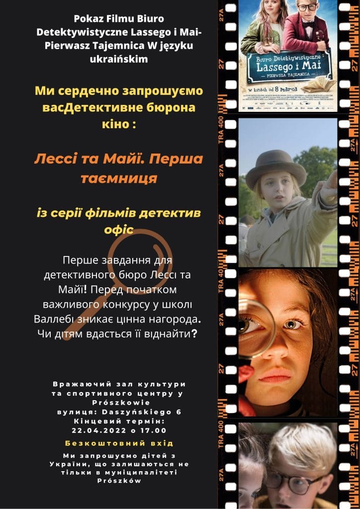PROJEKCJA FILMU DLA DZIECI Z UKRAINY Zapraszamy na projekcję filmu dla dzieci z Ukrainy w języku ukraińskim „BIURO DETEKTYWISTYCZNE LASSEGO I MAI – PIERWSZA TAJEMNICA„. Duża sala OKiS 22 kwietnia 2022 r. godz. 17:00. WSTĘP WOLNY