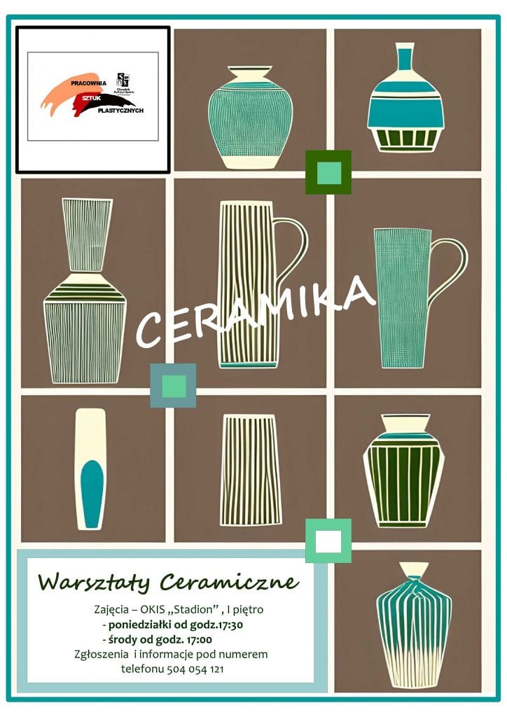 PRACOWNIA CERAMICZNA OKIS ZAJĘCIA PRACOWNI CERAMICZNEJ – OKIS „Stadion” , I piętro – poniedziałki od godz.17:30 – środy od godz. 17:00 Zgłoszenia i informacje pod numerem tel. 504 045 121 Zapraszamy do udziału oferujemy: toczenie na kole garncarskim, wyciskanie w formach, lepienie ręczne, szkliwienie prac, wypalanie prac. REGULAMIN-PRACOWNI-CERAMICZNEJ-2