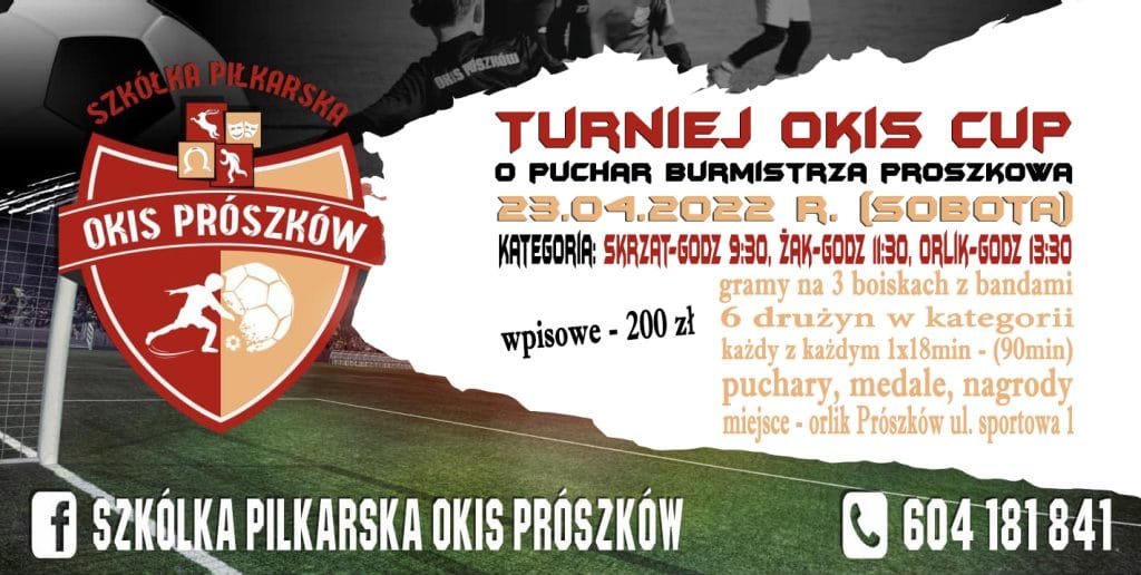 OKIS CUP O PUCHAR BURMISTZRA 23.04.2022 r. Piękna, ciepła, wymarzona PIŁKARSKA SOBOTA za nami, a to właśnie w tym dniu organizowaliśmy TURNIEJ OKIS CUP O PUCHAR BURMISTRZA PRÓSZKOWA 2022, który miał miejsce na boisku orlikowym przy Stadionie Miejskim w Prószkowie. W turnieju łącznie wzięło udział 180 zawodników, grając przez 4,5 godziny na 3 boiskach z bandami w trzech […]